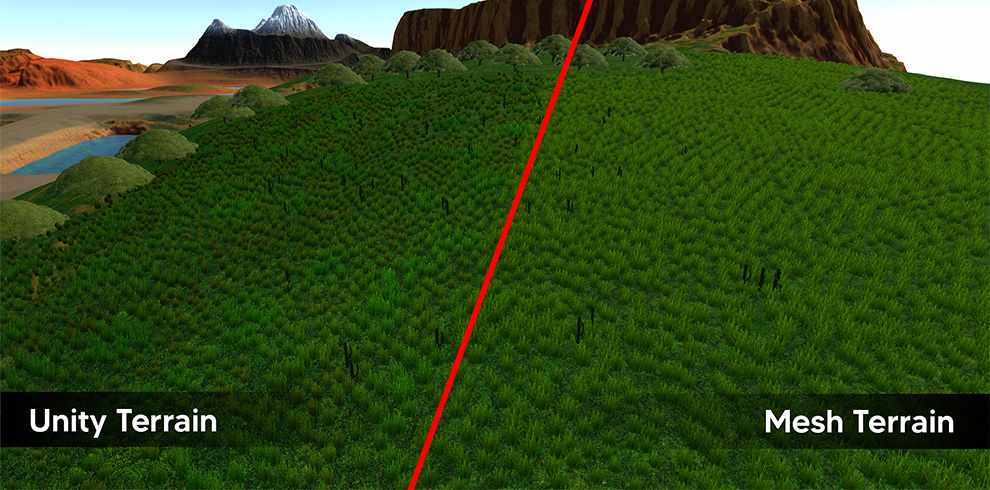 Splat Map material renders the terrain mesh similar to the Unity terrain except that it renders